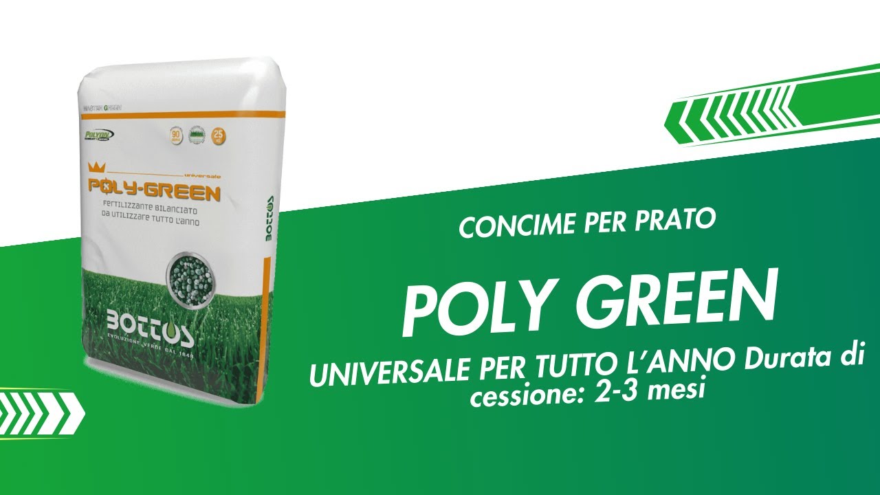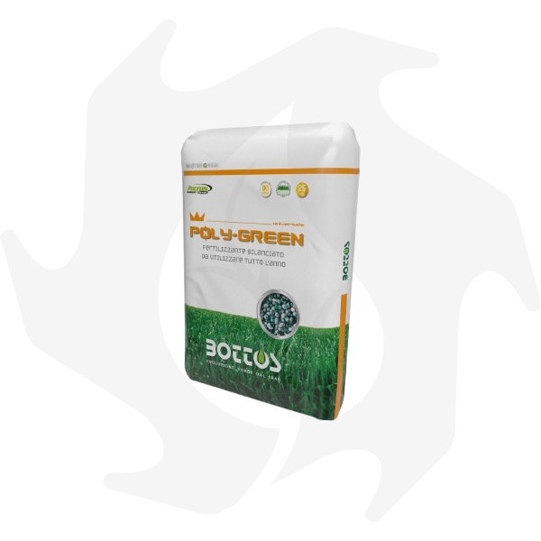 POLY GREEN è un concime professionale per prato 18-8-12 di Bottos caratterizzato da un rapporto nutrizionale di Azoto e Potassio particolarmente adatto per qualsiasi tipo di terreno e per tutto l’anno. POLY GREEN è indicato anche nella concimazione di alberi da frutto e di siepi.